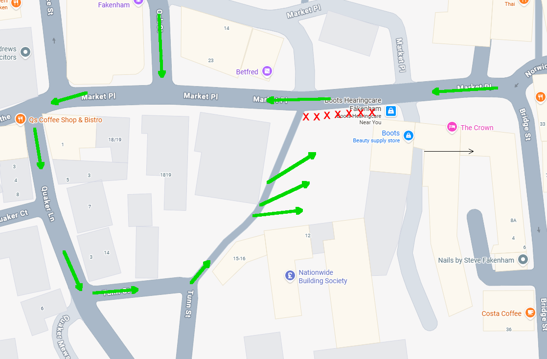 Vehicles attending the market place meeting are guided from the entry points into the market place area, being either via Oak Street or Market Place, into Quaker Street. Vehicles shall drive along Quaker Street then turning left into Tunn Street. Access into Fakenham Town Market Square shall be made only by this route. No other route shall be used. The statutory speed limits must be adhered to at all at times by the driver of the vehicle.